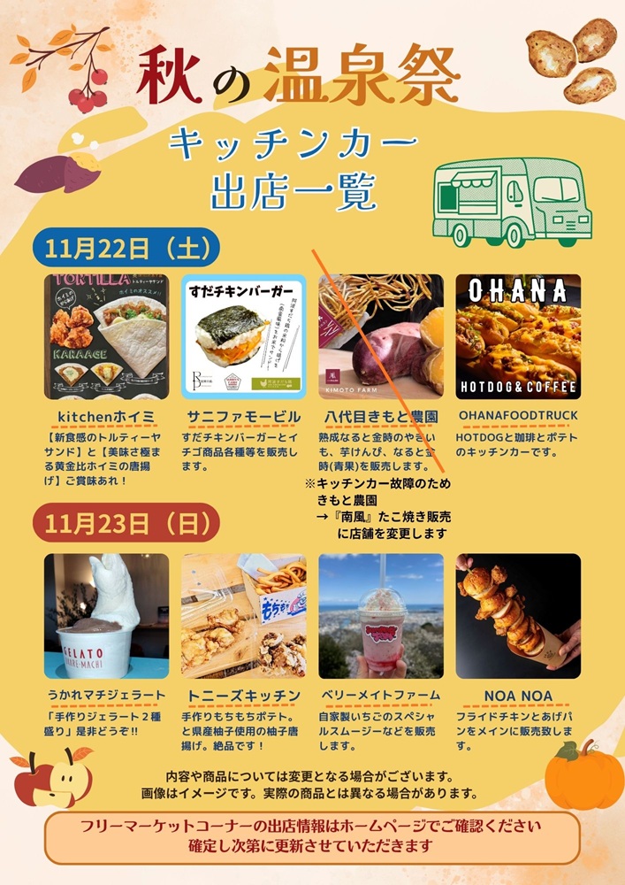 11/22(土)八代目きもと農園 → 南風(たこ焼き)に変更です。よろしくお願いいたします。