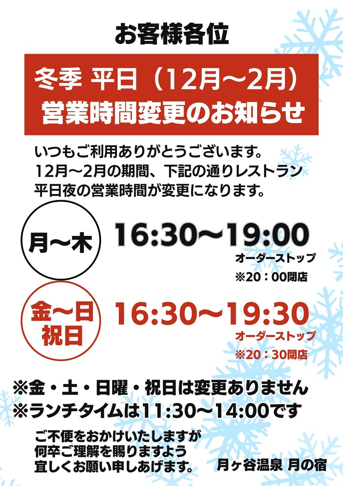 12月〜2月 冬季レストラン営業時間変更のお知らせ