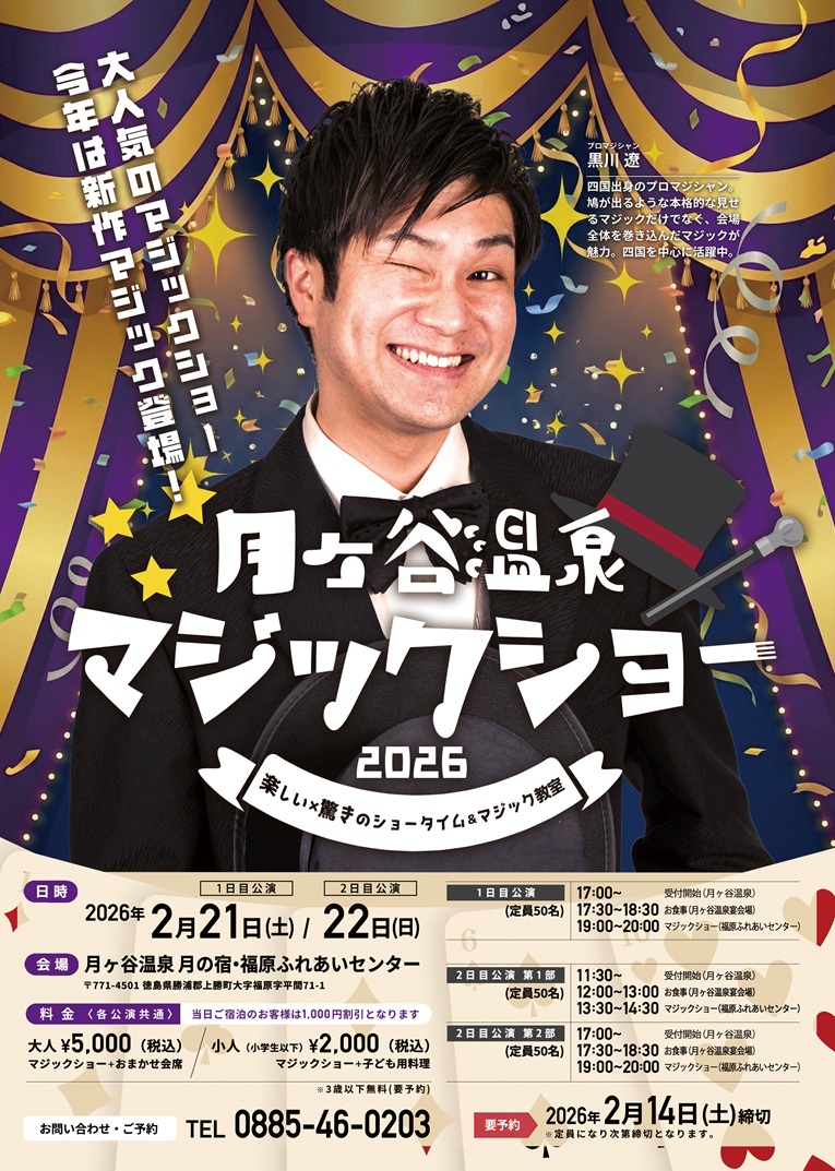 今年もプロマジシャン「黒川遼」氏による マジックショーを開催します! 新作マジックも登場しますのでぜひご覧ください♪ ■日時 【1】2026年2月21日(土) 17:00受付開始 17:30〜18:30 お食事(月ヶ谷温泉) 19:00〜20:00 マジックショー(福原ふれあいセンター) 【2】2026年2月22日(日) 11:30受付開始 12:00〜13:00 お食事(月ヶ谷温泉) 13:30〜14:30 マジックショー(福原ふれあいセンター) (1)2026年2月22日(日) 17:00受付開始 17:30〜18:30 お食事(月ヶ谷温泉) 19:00〜20:00 マジックショー(福原ふれあいセンター) ■料金 ・大人 ¥5000 ・小人(小学生以下)¥2000 ※ショー観覧+お食事付きです ★当日ご宿泊のお客様は上記金額より1000円割引となります お問合せ・ご予約は 月ヶ谷温泉 月の宿 まで 電話 0885-46-0203